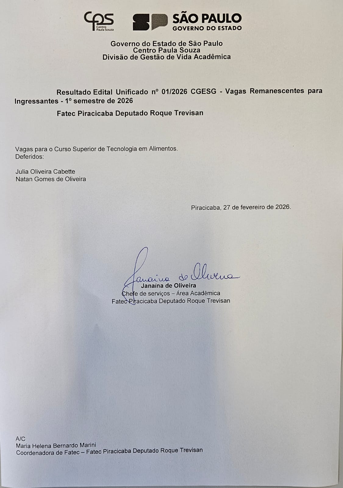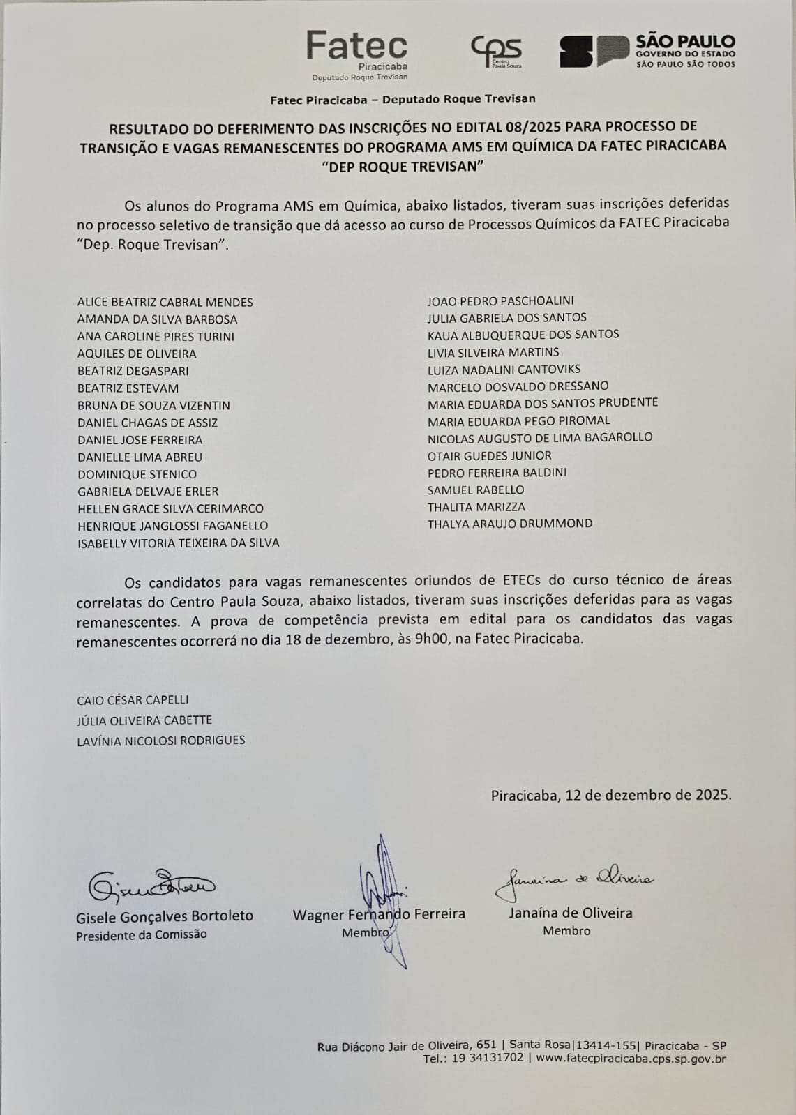 Edital de vagas remanescentes de transição do programa AMS – Curso Superior de Processos Químicos